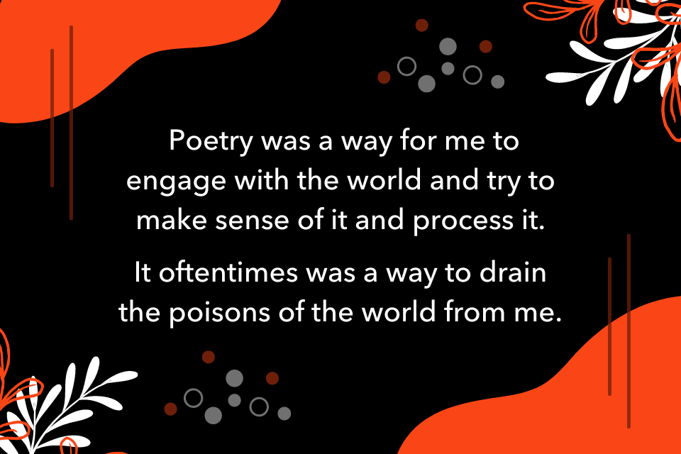 Poetry was a way for me to engage with the world and try to make sense of it and process it. It oftentimes was a way to drain the poisons of the world from me. “I’ve experienced this thing, I’m gonna put it on the page, and then I can have some distance from it, and it’s not something I’ve wrestled with in my subconscious.” For me, art is very therapeutic as well.